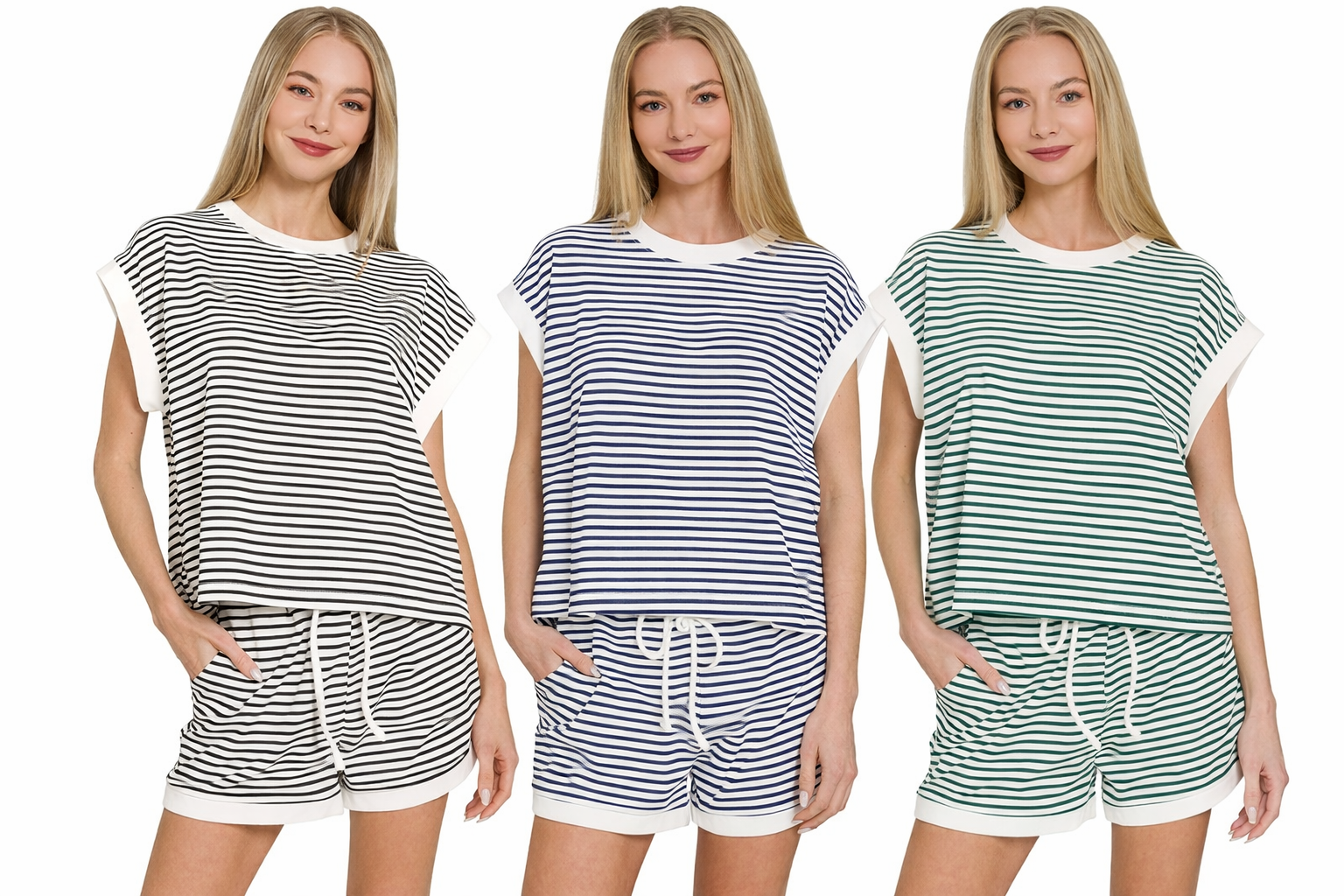 Sporty, comfy, and effortlessly cute—the Ballpark Stripe Set is your go-to for game days, casual weekends, and everyday wear. Featuring classic hunter green and cream stripes, this two-piece set brings an easy, relaxed vibe with a polished finish.